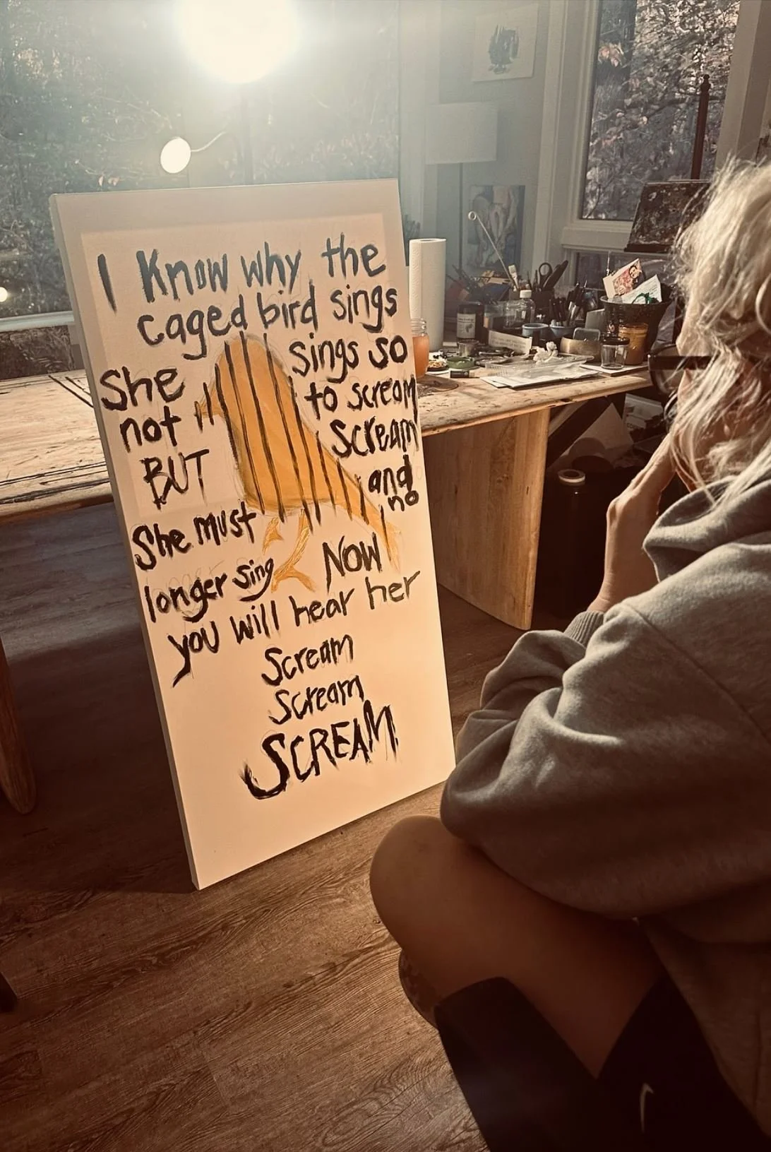 American Woman is the first painting I have ever created that did not start with a particular person in mind. I was feeling uplifted and inspired by the sea of black, brown, cream, rainbows, hijabs, dreadlocks, kippahs…young and old and in-between…men and women and those in-between. I created faces that represented that hopeful sea. Everyone smooshed together, all belonging. I even squeezed in the Statue of Liberty while quietly remembering, “give me your tired, your poor, your huddled masses yearning to breathe free.” I’m sure we all know those words but Jewish-American Poet Emma Lazarus didn’t stop there. She went further adding “until we are all free, we are none of us free.”